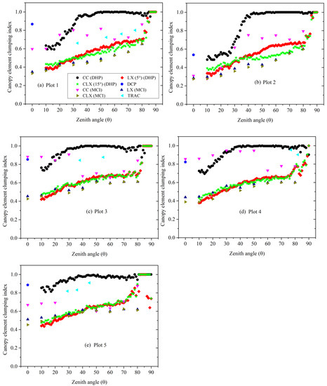 Large differences were observed between the or obtained from DHP and MCI using the same or algorithm as well as from DHP or MCI using different or algorithms in the five leaf-on or -off plots (Figure 3 and Figure 4). For example, the differences between the of DHP and MCI in leaf-on plot 2 are 0.25, 0.16, and 0.05 for the three algorithms of CC, LX, and CLX, respectively (Figure 3); the differences between the of CC and LX as well as CC and CLX in leaf-on plot 2 are 0.36 and 0.47 for DHP, respectively (Figure 3). However, the trend of the or obtained from TRAC was nearer to that of MCI derived using CC with a similar zenith angle in the five leaf-on or leaf-off plots, except leaf-on plot 5 in most circumstances (Figure 3 and Figure 4). Similarly, no large differences were found between the or measurements obtained from DCP and MCI using CC in the five leaf-on plots, except plots 1, 2, and 5, or five leaf-off plots, except plots 1 and 2 (Figure 3 and Figure 4). Interestingly, no large differences (<0.07) were observed between the or obtained from MCI using LX and CLX in the five leaf-on or leaf-off plots, except leaf-off plot 5 (Figure 3 and Figure 4). For DHP, CC tended to produce or estimates equal to 1 at the zenith angle range of approximately 40°–90° in the five leaf-on or leaf-off plots (Figure 3 and Figure 4). That indicates that CC was not performed well in estimating the or of the five leaf-on or leaf-off plots from DHP at the zenith angle range of 40°–90°.