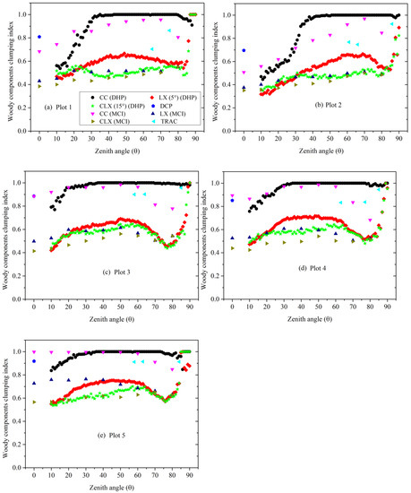 Based on Table 4, Table 5, Table 6 and Table 7, the ESU LAI estimation of DHP and MCI was largely affected by the canopy element or woody components clumping index ( or ) algorithm and inversion model adopted in the estimation. This finding is consistent with the conclusions drawn in previous studies [19,24,32,41]. As expected, large differences were found between the LAIs obtained from DHP or MCI using the same inversion model and woody components correction method but with different or algorithms or the same or algorithm and woody components correction method but with different inversion models (Table 4 and Table 6). Three factors contributed to the large LAI differences: the obvious variation of or and or at the zenith angle range of 0°–90° (Figure 1, Figure 2, Figure 3 and Figure 4); the large differences between the or derived using different algorithms (Figure 3 and Figure 4) and the different zenith angle ranges covered by the four inversion models (Table 2).