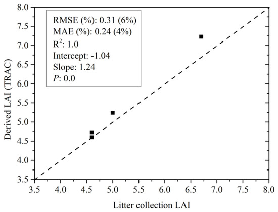 Comparison of LAI obtained from TRAC with litter collection LAI in the five plots. Statistics are given at 95% confidence level from the two-tailed Student’s t-test. The RMSE and MAE are expressed in LAI units (m2/m2).