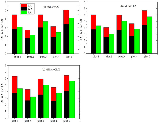 The LAIs obtained from DCP, DHP, and MCI in the five plots were remarkably affected by the woody components correction methods used in the estimation (Table 4, Table 5, Table 6, Table 7, Table 8 and Table 9). For example, the difference was as large as 1.87 (49%) in plot 1 between the LAIs obtained from the leaf-on DHP images using CLX and Miller but with two woody components correction methods of MCI woody-to-total area ratio and the WAI obtained from the leaf-off DHP images, respectively (Table 4). For DHP, large differences were observed between the RMSE or MAE of the LAIs obtained using the same or algorithm and inversion model but with two woody components correction methods of MCI woody-to-total area ratio and the WAI derived from the leaf-off DHP images in the range of 0.72–1.04 (16%–23%) or 0.74–1.14 (17%–27%) (Table 5). However, small differences were found for DHP between the RMSE or MAE of the LAIs obtained using the same or algorithm and inversion model but with MCI and destructive woody-to-total area ratio values (Table 5). Like DHP, large differences were also observed for MCI between the RMSE or MAE of the LAIs obtained using the same or algorithm and inversion model but with the two woody components correction methods, ranging from 0.05–1.09 (1%–24%) or 0.04–1.13 (9%–26%) (Table 7). The LAI obtained from DHP or MCI or DCP using the woody components correction method of WAI derived from the leaf-off DHP or MCI or DCP images was obviously smaller than that derived using the same inversion model and or algorithm but with other woody components correction methods (Table 4, Table 6, and Table 8).