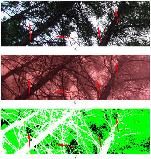 The or of MCI tends to be smaller than those of DHP and DCP in the five plots (Figure 1 and Figure 2) because of two reasons. Firstly, the isolated shoots and branches in the visible band of the MCI or DHP images tended to be easily overexposed due to the high contrast between the canopy element and the sky (Figure 7a). However, the contrast between the canopy element and the sky or cloud in the near-infrared band of MCI is relatively small (Figure 7b) [61]. Secondly, the shoots have a low reflectance in the visible band due to the strong absorption by chlorophyll, a relatively high reflectance in the near-infrared band due to the internal leaf scattering, and no absorption [62]. Consequently, the shoot sizes in the near-infrared band were larger than those in the visible band for the same shoot (Figure 7a,b). This issue was not carefully considered by the “IsoData” classification algorithm adopted in the MCI image classification.