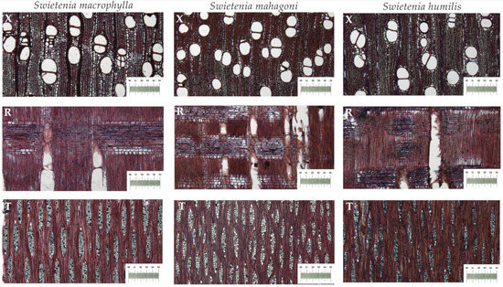 Mature wood of 278 Swietenia specimens (198 Swietenia macrophylla, 65 Swietenia mahagoni, and 15 Swietenia humilis) from the Samuel J. Record Collection (SJRw), the USDA Forest Products Laboratory Wood Collection (MADw) of Madison, Wisconsin, and the wood collection (RBw) of the Botanic Garden of Rio de Janeiro in Brazil was selected. Wood microscopy and microtomy were performed as in [43] and images of three planes of sections of S. macrophylla, S. mahagoni, and S. humilis are shown in Figure 1.