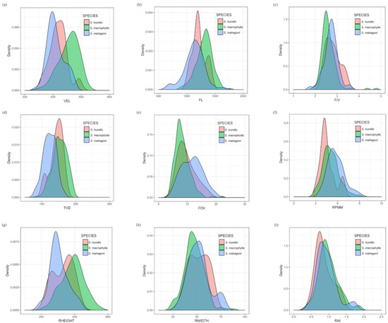 Smoothed data density histograms of the nine characters are presented in Figure 2. Not surprisingly, none of the three Swietenia species could be separated by any single quantitative character because the data distribution within and between species showed overlap for all characters.