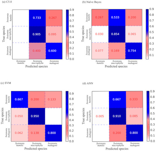 Confusion matrices reporting performance metrics for the four supervised classifiers, namely, DT, NB, SVM, and ANN are presented in Figure 3. The true species are reported on the left and the predicted species are given in the columns, such that on-diagonal predictions are correct and all other predictions are incorrect. The value in each cell is the proportion of the total predictions, and each row always sums to 1.0. Of the four supervised classifiers, SVM showed the best overall performance (91.4%), followed by ANN (83.8%), NB (79.5%), and DT (78.4%). Using the SVM classifier, the three Swietenia species could be separated with a relatively higher accuracy, i.e., 66.7% for S. humilis, 95.0% for S. macrophylla, and 80.0% for S. mahagoni. However, the DT and ANN classifiers failed to predict S. humilis correctly.