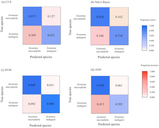 Figure 4 presents the confusion matrices for the two-species model discriminating between Swietenia mahagoni and Swietenia macrophylla. The four supervised classifiers exhibited overall accuracy values of over 80%, being i.e., 93.9% (SVM), 85.2% (ANN), 81.7% (NB), and 81.4% (DT). SVM was able to discriminate between S. macrophylla and S. mahagoni with thresholds of 94.9% and 90.8%, respectively. The results indicated that the two-species model performed slightly better than the three-species model.