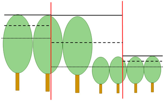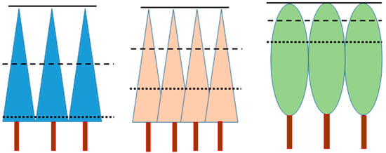 Three different canopies with the same maximum height (continuous horizontal lines) but different mean (dashed lines) and minimum (dotted lines) heights. Combined use of maximum, mean, and minimum heights helps to detect differences in stand density and crown form.