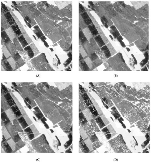 A 500 m × 500 m subarea of the case study forest. (A) is the original canopy height model (CHM) (cell size 1 m); (B) shows the maximum, (C) shows the mean, and (D) shows the minimum canopy height in 5 m × 5 m cells. Dark tone implies high canopy height.