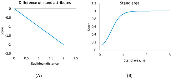 The values of the parameters were a1 = −5, a2 = 0.5, b1 = −10, and b2 = 0.7. They resulted in the relationships shown in Figure 5. The distance of stand attributes between cell i and stand j was a weighted Euclidean distance.