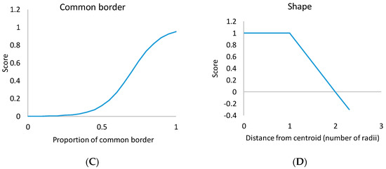 The proportion of common border between cell i and stand j (Bij), as well as the area of stand j (Aj), had a nonlinear effect on the score (Figure 5). The sigmoid type of relationship between stand area and score led to the avoidance of small stands, but stand area ceased to increase the score after about 1.5 ha. This means that very large stands were not considered better than 1.5-ha stands. A sigmoid relationship between common border (Bij) and score led to avoiding stands that were composed of narrow strips of cells [8]. The common border criterion affected stand shape at the local cell level, whereas the stand shape criterion took into account the overall shape of the whole stand.