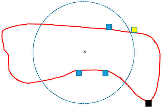The principle of taking stand shape into account in the cellular automaton. Symbol × is the centroid of the stand shown with a red line. The dotted line is a circle with the same center and area as the stand. Small rectangles are cells of a grid. Joining the blue cells to the stand produces full shape points since they are within the radius of the circle. The yellow cell gets a small shape penalty, and the black cell gets a large penalty because these cells have an adverse effect on the shape of the stand.