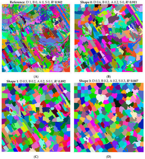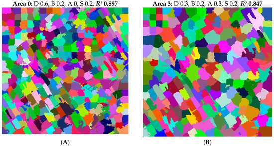 Effect of stand area criterion on the result of cellular automaton run (different colors indicate different stand numbers). The weight of stand area was 0 (A), or 0.3 (B). R2 is the degree of explained variance for maximum canopy height. Letters D, A, B, and S refer to the criteria of Equation (1) (D = distance, B = common border, A = area, S = shape), and the numbers are criterion weights.