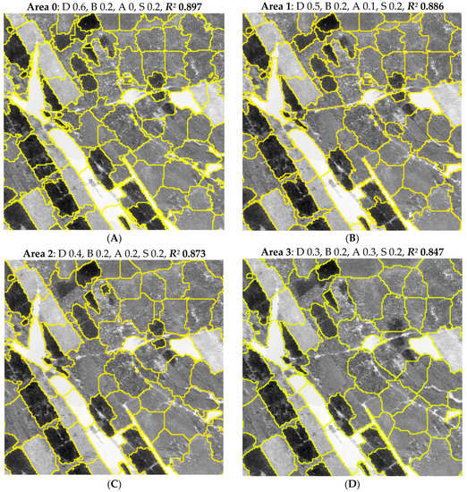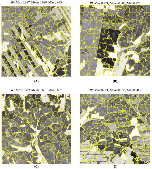 Delineations obtained for four areas (A–D) with the same CA parameters. The weights of the delineation criteria were v1 = 0.4 (homogeneity), v2 = 0.1 (area), v3 = 0.2 (border), and v4 = 0.3 (shape). The parameters of the sub-priority functions (Equations (2) and (3)) were: a1 = −1, a2 = 1, b1 = −3, b2 = 0.5. Species layers were not used in delineation. The R2 statistics are shown for the maximum, mean, and minimum canopy height.