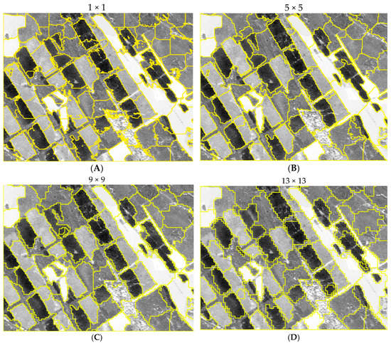 A part (about 500 m × 500 m) of the canopy height model (1-m resolution) with the stand delineations obtained when the cell size was 1 (A), 5 (B), 9 (C), or 13 m (D).