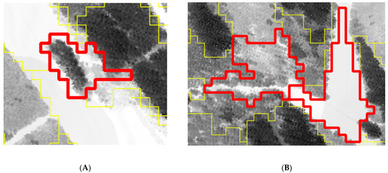 Comparison of the canopy height model and the stand borders showed that stands with tall trees were enlarged and some stands with short trees shrank, compared to the location of the stand edge in the canopy height model (Figure 10). This phenomenon can be seen more easily from Figure 11, which shows two details from the stand delineation obtained with 13-m cells. The overestimation of the area of stands with tall trees was mainly due to the high weight of maximum canopy height in Equation (4) (Table 1) and the fact that the maximum canopy height of a mixed cell (cell located at stand border) is taken from that part of the cell where the trees are taller (see Figure 2).