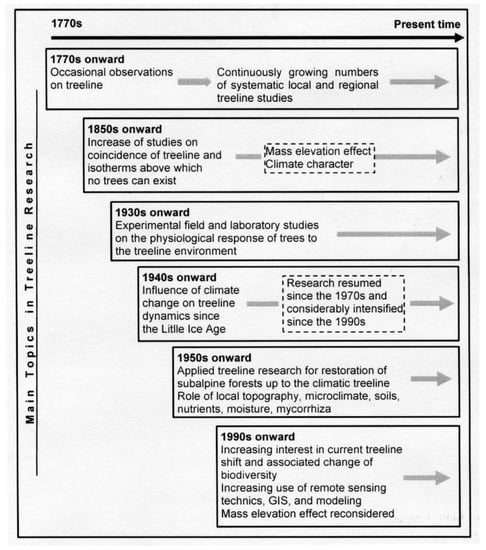 Early treeline research started around the end of the 18th century and the beginning of the 20th century. In the beginning, treeline research was closely linked with the exploration of high-mountains and the northern forest-tundra. There were occasional and more general observations, including the physiognomy and distribution of vegetation and hypotheses on the influence of climate on treeline (e.g., [9,10,11,12,13,14,15,16]) (Figure 1).