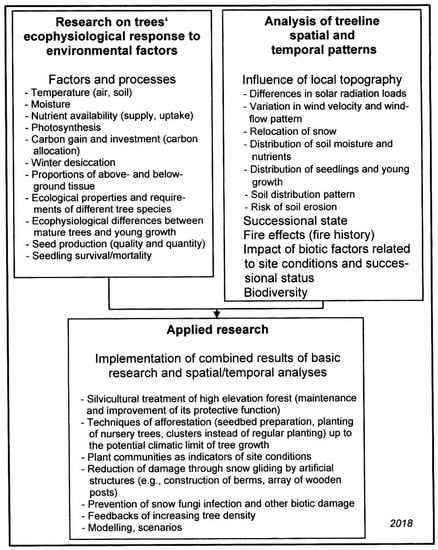 Traditional ground-based repeat photography (e.g., [168,171,203,246,247,248,249,250,251]), remote sensing techniques (oblique air photos, satellite images) and GIS data (e.g., [181,242,252,253,254,255,256,257,258,259,260,261,262,263,264,265,266,267,268,269,270]) have effectively supported the analysis of current (and also of historical) treeline spatial patterns and temporal variation such as treeline fluctuations, especially in remote areas and areas difficult to access, such as steep and rugged mountain terrain [270,271]. These studies have also contributed to a more complex view of the driving factors and also underlined that factors and processes vary by scale of consideration (e.g., [159,180,184,205,272,273]) (Figure 4). Thus, in addition to the numerous studies on the physiological response of treeline trees to heat deficiency at the broader scales (global/zonal/regional), the influences of local topography (landforms) on treeline spatial patterns and associated ecological processes have been increasingly studied, particularly in Austria and Switzerland (e.g., [75,274,275,276,277]) (Figure 4). During the last decades, this issue has moved again in the focus of treeline research worldwide (e.g., [147,148,149,156,227,229,278,279,280,281,282,283,284,285,286,287,288,289,290,291,292,293]).