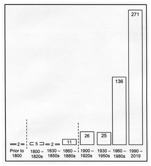 Treeline fluctuations due to warming and cooling periods after the end of the Little Ice Age and during the 20th century were already considered in numerous studies ([2], for literature). However, it appears that the climatically driven current treeline advance to greater elevation and to northern latitude has even attracted greater attention (Figure 1). During the last three decades, especially since the 1990s, publications on this topic have rapidly increased (by about 90%), partly in a broader context with the change of vegetation and biodiversity, and the expected implications for the ecosystem functions and services of high-elevation forests (e.g., [88,134,167,181,182,183,184,185,186,187,188,189,190,191,192,193,194,195,196,197,198,199,200,201,202,203,204,205]) (Figure 3). Dendrochronology, pollen analysis, sediment analysis, and radiocarbon-dating of fossil wood remains (mega fossils) have provided a profound insight into Holocene treeline fluctuations (e.g., [203,206,207,208,209,210,211,212,213,214,215,216,217,218,219,220,221,222,223,224]). In not a few cases their after-effects have lastingly influenced the current treeline position and spatial patterns (e.g., [1,2] and references therein).