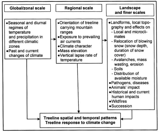 Scales of consideration play an important role in treeline research, as treeline heterogeneity, spatial mosaic, and ecological variety increase from coarse (global, zonal) to finer (regional, landscape, micro) scales (Figure 4). Finer scale assessments of the relative importance and function of the treeline-relevant factors and processes (human impact included) are fundamental for better understanding of treeline causation and its possible response to climate (environmental) change.