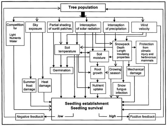 Feedbacks of increasing tree population on site conditions, seedling erstablishment, and survival (modified from [2]).