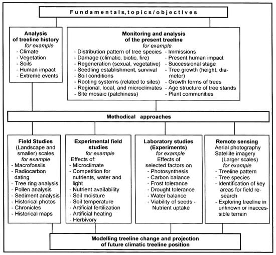 Remote sensing techniques and GIS have become excellent tools for monitoring treeline spatial patterns and structures at coarse and finer scales, particularly in areas difficult to access. Such innovative research techniques will be needed to come to a better assessment of the multiple and often mutually influencing factors and processes controlling treeline causation, spatial patterns, and dynamics. Thus, they will also promote projection of future treeline position (Figure 6).