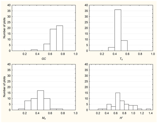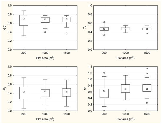 The mean values of GC and T4 on plots ranging from 200 m2 to 1500 m2 were constant, amounting to 0.67 and 0.47, respectively. Likewise, the mean values of M4 (0.41–0.42) were also stable across plots of different sizes. The values of H′ index increased with plot size (Table 1). GC was characterized by left-skewed frequency distributions regardless of plot size (for the largest 1500 m2 plots, p < 0.001). On the other hand, T4 and M4, as well as the Shannon index (H′) for tree species diversity, exhibited normal frequency distributions regardless of plot size. However, heteroscedasticity was significant for GC (p < 0.001), T4 (p = 0.015) and M4 (p = 0.010), whereas H′ index had equal variances between plots of different size.
