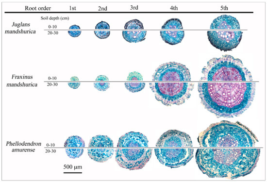 Typical anatomical structures the first five orders of roots in surface (0–10 cm) and subsurface (20–30 cm) soil layers in Juglans mandshurica, Fraxinus mandshurica, and Phellodendron amurense.