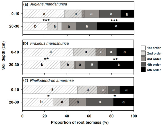 Proportions of root biomass (PRB) in different root orders to total fine root biomass (first five root orders) at surface (0–10 cm) and subsurface (20–30 cm) soil layers in Juglans mandshurica (a), Fraxinus mandshurica (b), and Phellodendron amurense (c), respectively. Different lowercase letters indicate significant differences (p < 0.05) in PRB within a root order between soil layers according to Fisher’s least significant difference (LSD) test. Asterisks indicates significant differences (*** p < 0.001, ** p < 0.01, * p < 0.05) in the PRB of absorptive (with diagonal lines) or transport (without diagonal line) fine roots (based on Table 1) between soil layers according to Fisher’s LSD test, respectively.