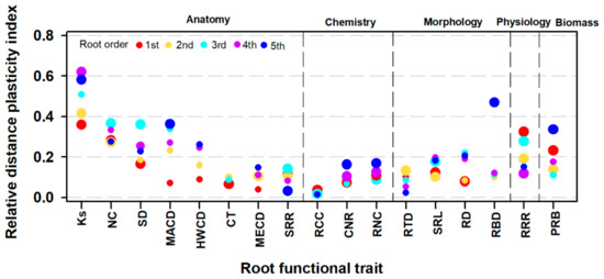The relative distance plasticity index (RDPI) of root functional traits in response to soil depth in the first five root orders. Large points indicate that the averaged RDPI across the three species is significantly different from zero (no plasticity) according to a t-test (p < 0.05), while small points indicate that the difference is not significant (p > 0.05). The trait abbreviations are as in Table 2.