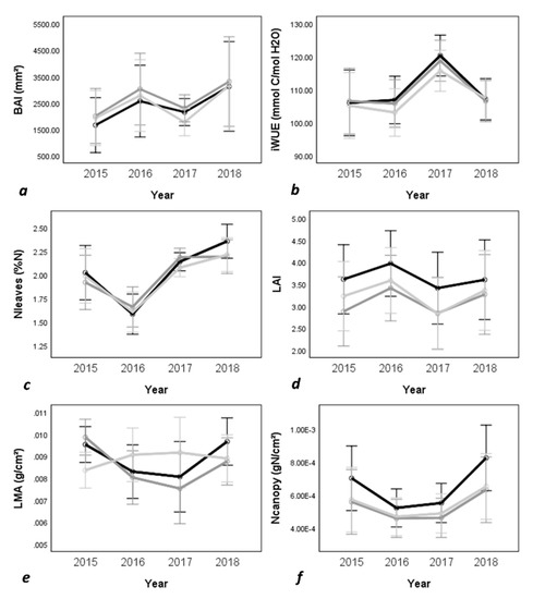 Trend of basal area increment (BAI, a), intrinsic water use efficiency (iWUE, b), relative leaf nitrogen content (Nleaves, c), leaf area index, (LAI, d), leaf mass per area (LMA, e) and canopy nitrogen content (Ncanopy, f), observed in the three different treatments during the 4 years observation period. Data points represent mean values of three plots. SE are shown in vertical bars. Black line = above canopy fertilization; dark grey line = below canopy fertilization; light grey = control).