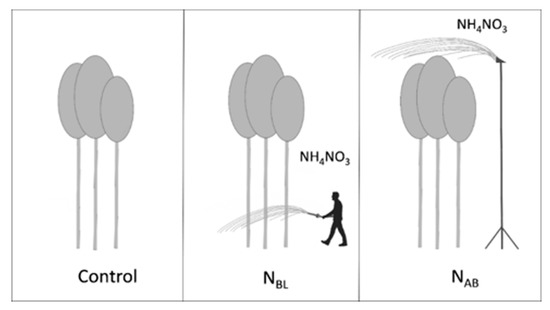 The forest lies on an acid brown soil originating from porphyritic quartz rock. Average annual temperature at the site is 11.4 °C, whereas average annual precipitation is 800 mm [45]. The experimental design consisted of a set of nine circular plots (12 m radius), three for each different treatment: unfertilized control plot, fertilization by adding NH4+NO3− directly to the ground (i.e., traditional fertilization, NBL) and fertilization by adding NH4+NO3− to the canopy by aerial mist spraying (i.e., aerial fertilization, NAB; Figure 2). The nine plots were arranged in a completely randomized design and were established close to each other, in an area of about 200 m of length, but with at least 10 m of distance between each plot. This was chosen in order to minimize the variation of stand conditions while avoiding issues related to drifting of the fertilizer during applications. The NH4+NO3− solution (4.3 g N/L) was applied at ground or canopy level (at 15–18 m height, depending on plot maximum tree height) by aerial mist spraying, resulting in a deposition of 20 kg ha−1 yr−1, which was more than three times higher than background atmospheric N deposition [45]. A gasoline powered pump (Officine Carpi S.R.L., Poviglio, Reggio Emilia, Italy) was used to ensure the needed pressure. The pump was then connected, for aerial fertilization, to rotating sprinklers (Rain Bird SNC, Aix-en-Provence, France) mounted on telescopic posts (Fireco S.R.L., Gussago, Brescia, Italy) installed at the center of the Nab plots. These sprinklers provided a spray radius of 12 m, covering the whole plot when operating at a pressure of 2 bars. Tests on the uniformity of the quantity of water provided in the covered area were performed before installation. For NBL plots, the NH4+NO3− solution was applied manually with a water hose and a spray nozzle, paying attention to uniformly distribute the solution in the treated area. The fertilization was provided in five application dates, monthly from May to September starting from May 2015. The amount of water provided in each plot with fertilization (210 L H2O yr−1) is equivalent to a precipitation of 0.46 mm for the season, which is negligible if compared to the average annual precipitation of the region.