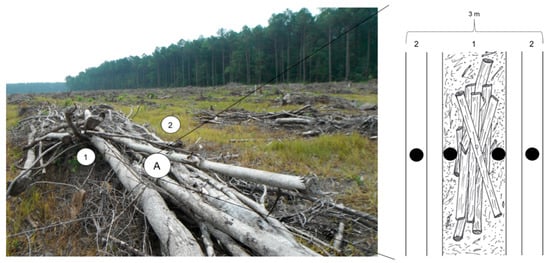 A harvest residue pile in a clear-cut stand two-years post-harvest in North Carolina. Stands consisted of uniformly dispersed interbeds containing harvest residues (1) and bedded rows containing planted pine seedlings (2). We set pitfall traps immediately adjacent to either side of harvest residues piles, when present, and two pitfall traps were situated in bedded rows on either side of the interbed (A). Photo by Sarah Fritts. Drawing by Steve Grodsky.
