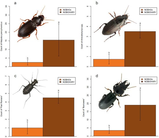 Response of (a) Harpalus pensylvanicus (Photo credit: Salvador Vintanza), (b) Anisodactylus spp.-A. haplomus pictured (Photo credit: Iustin Cret), (c) the “Fast Runner” functional trait-Cicindelidia punctulata punctulata pictured (Photo credit: Chris Wirth), and (d) the “Burrower” functional trait–Scarites subterraneus pictured (Photo credit: John and Kendra Abbot/Abbott Nature Photography) to no retention of harvest residues (NOBHGs) and complete retention of harvest residues (NOBIOHARV) treatments in clear-cut stands, North Carolina, 2013. Different letters indicate significantly different pairwise comparisons of treatment means. We set α = 0.05. See Supplementary Materials for comparisons of all harvest reside retention treatment means.