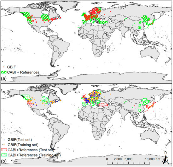 Making adjustments based on the native distribution of species is a crucial step in determining species CLIMEX parameters. Known distribution data were mainly collected from the Commonwealth Agricultural Bureaux International (CABI; http://www.cabi.org/cpc, accessed on 13 November 2018), the Global Biodiversity Information Facility (GBIF, https://www.gbif.org, accessed on 3 December 2018), and the existing literature (Figure 1a). Distribution records collected prior to 1987 were removed to limit the effect of historical changes in the climate and any duplicate records, such as multiple records for the same location. For the analysis, 75% of the occurrence records were randomly selected from the total global occurrence records as the training set for a CLIMEX parameter adjustment. The remaining occurrence records were used to test the model (Figure 1b). The known distribution covers 33 countries throughout Asia, Europe, and North America, among which China, Canada, the United States, Italy, France, Spain, Hungary, Bulgaria, and Romania have suffered the most serious damage.