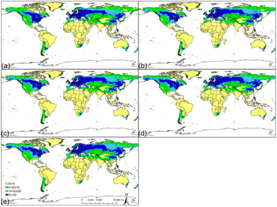 The area of the very favorable region covered 21.83 × 106 km2, which accounts for 14.65% of the total land area. The very favorable region was mainly located in North America, Europe, and Asia, including Southern Canada, Eastern United States, China, Central and Eastern Argentina, and most regions of Europe and Western Russia. The area of the favorable region was 18.93 × 106 km2, which accounts for 12.70% of the total land area in the world. The favorable region was mainly located in North America and Asia, with small areas in Europe, Africa, and Oceania. The favorable region included Southern Canada, Central United States, large parts of Russia, and Eastern China. The area of suitable region was 32.68 × 106 km2, which accounts for 21.93% of the total land area. The suitable region was mainly located in North America, Africa, and Asia, including large parts of Alaska, Argentina, Kazakhstan, Uzbekistan, Japan, Iran, Western Canada, United States, and Northeastern Russia.