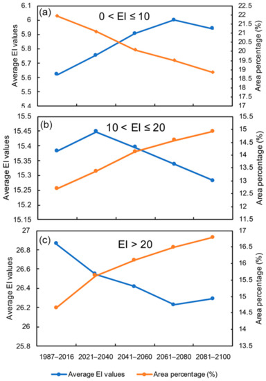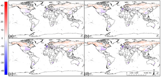 The potential distribution of C. lapathi under future climate conditions is shown in Figure 2b–e. In general, the climatically suitable regions would move northward, from 74 °N to 76 °N by 2081–2100. Some very favorable regions would shift to a favorable region, and some favorable regions would become very favorable. The potential distribution (expressed as percentages) for the pest on each suitable range under future climate conditions are shown in Figure 3. The total suitable areas would increase by 2080–2100. The impacts of climate change on the climatic suitability of the pest are shown in Figure 4. Climatic suitability would clearly change in large regions of the northern hemisphere and decrease in a small region of the southern hemisphere. The average EI values would change slightly in the future (Figure 3).