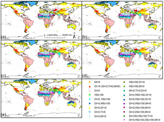 Distribution maps for five different conditions. (a) 1987–2016, (b) 2021–2040, (c) 2041–2060, (d) 2061–2080, and (e) 2081–2100. MI-Moisture Index, GI-Growth Index, DI-Diapause Index, HS-Heat Stress, WS-Wet Stress, TI-Temperature Index, MI-Moisture Index, and DS-Dry Stress.