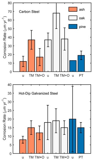 It appears in the hardwoods that galvanized steel corrodes more slowly than carbon steel. This can be seen most clearly for oak, where the corrosion rate for carbon steel (37 µm year−1) was nearly double that of galvanized steel (19 µm year−1). Galvanized steel also corroded more slowly than carbon steel across the thermal modification and oil treatments (Note that in this study, the mean corrosion rate of galvanized steel was slightly lower than that of carbon steel, however, the results are not statistically different and contradict the previous literature. The remainder of the discussion comparing the different treatments and species compares the results to the literature values in treated pine). Therefore, one important finding of this study is that galvanized steel corrodes more slowly than carbon steel in hardwoods whereas it generally corrodes more rapidly in preservative-treated wood. The corrosion mechanism in treated wood involves the reduction of cupric ions from the wood preservative. Since zinc is less thermodynamically stable than steel in the presence of cupric ions, it could be that this larger driving potential is accelerating the kinetics in preservative-treated wood. Limited data has shown that galvanized steel also corroded more rapidly than carbon steel in untreated pine, however, the absolute values of these corrosion rates were small, the error bars high, and the results statistically uncertain. This study has highlighted how little is known about our understanding of the corrosion rates in different metals in untreated wood species. Beyond scientific importance, quantifying the relative corrosion rates of different metals is incredibly important for materials selection, as materials that work well in pressure-treated pine may not work well in hardwoods.