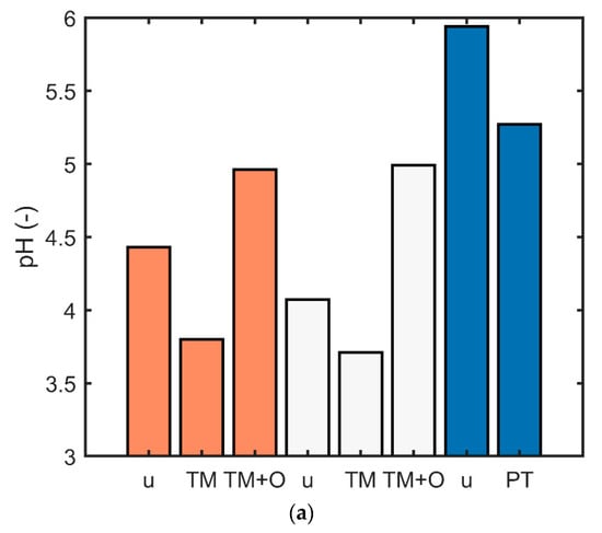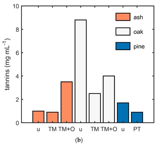 pH (a) and concentration of tannins (b) found in the different wood treatments. Legend: u = untreated, TM = Thermally Modified, TM + O = Thermally Modified with Oil treatment, PT = Preservative Treatment.