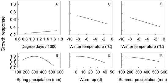 Climate response (fraction of potential growth) of trees inferred from tree ring growth from 1978–2011 in an old-growth hemlock stand on the Helderberg plateau in east–central New York. (A) Effect of growing temperatures (degree-days) on hemlock growth. (B) Effect of spring precipitation on hemlock. (C) Effect of summer temperature on yellow birch growth. (D) Effect of warm spring days (three-day mean >5 °C) on yellow birch growth. (E) Effect of mean winter (December–January–February) temperatures on sugar maple growth. (F) Effect of summer precipitation on sugar maple growth.