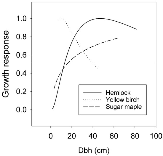 Eastern hemlock (Tsuga canadensis L.), yellow birch (Betula alleghaniensis Britton), and sugar maple (Acer saccharum Marsh.) are iconic species of mixed northern hardwood forest. Sugar maple and hemlock are characterized as highly shade-tolerant [12] and, by implication, as tolerant of competition. Yellow birch, in contrast, is classified as intermediate in shade tolerance and, thus, potentially more vulnerable to competition for light [12,13]. Consistent with this shade-tolerance ranking, the eastern United States of America (USA) studies of Canham et al. [14] indicated that yellow birch was highly sensitive to competition, that sugar maple was also sensitive but not as much as birch, and that hemlock was still less sensitive. The ability of these species to compete against other species for resources (i.e., their competitive effects as opposed to competitive response), however, is less well known despite being an important element of competition [15]. Growth rates of trees are further dependent upon size, in a species-specific manner. For hemlock, most rapid growth occurs for adult trees roughly 60 cm in diameter at breast height (dbh), there is little or no relationship between yellow birch size and growth rate, and sugar maple growth increases asymptotically with size [14].