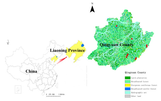 An overlay of nine selected stands of larch plantations (marked by red dots) in Qingyuan Manchu Autonomous County (Qingyuan County), Liaoning Province, Northeast China.