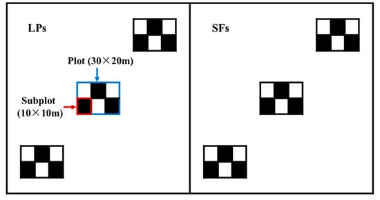 Three 20 × 30 m plots were randomly set up in each stand of LPs and adjacent SFs. There were 54 plots in total. Each plot was divided into six 10 × 10 m subplots. The investigation and sampling were conducted in August 2017. The basal diameter (D), total tree height (H), age (Yr), and composition of all the understory woody plants (including trees and shrubs) were surveyed in three subplots that were selected by a ‘Λ’ pattern (black square in Figure 2). The basal diameter was measured by an electronic digital indicator at a height of 2 cm, and the total tree height was measured by the meter rule. For the broadleaved trees with D > 2 cm, the age was determined by counting the tree rings after the trees were cut down, and we also counted the whorled branches of some saplings to supplement the age. For broadleaved woody plants with D ≤ 2 cm, the age was defined by counting the whorled branches or the branch (leaves) scars of each seedling.