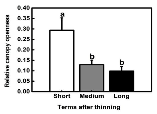The relative canopy openness in the short term after thinning was approximately two times higher than that in the medium and long terms after thinning (p < 0.05), but there was no significant variation in canopy openness between the medium and long terms after thinning (p > 0.05) (Figure 3).