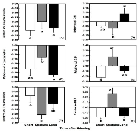The relative soil C, N, and P concentrations and soil C:N ratios had no significant variation among the three terms after thinning (Figure 4). However, post hoc analysis showed that the relative soil N concentrations in the medium term after thinning were remarkably higher than those in the long term after thinning (Figure 4B), the relative soil P concentration in the medium term after thinning was remarkably lower than that in the short term (Figure 4C), and the relative soil C:N ratio in the long term after thinning was significantly larger than that in the medium term (Figure 4D). There were significant change for soil C:P and N:P ratios at different thinning terms. The relative soil C:P ratio in the medium term was significantly higher than that in the short term after thinning (p < 0.05) (Figure 4E). The relative soil N:P ratio in the medium term was significantly higher than that in both the short and long terms after thinning (p < 0.05) (Figure 4F).
