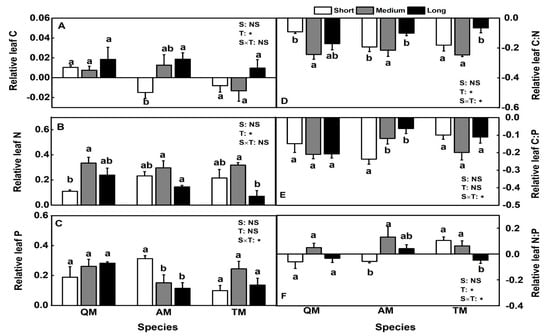 Relative values of leaf stoichiometric characteristics (A–F) in different regenerated broadleaved trees (QM, AM, and TM) with three terms after thinning in larch plantations (LPs). Values were shown as means ± S.E. (n = 3). QM = Quercus mongolica; TM = Tilia mandshurica; AM = Acer mono. Short term: 1–3 years after thinning; medium term: 4–9 years after thinning; long term: ≥10 years after thinning. S: Species; T: term after thinning. NS: not significant; *: p < 0.05. Different lowercase letters represent significant differences among three terms after thinning for the same species.