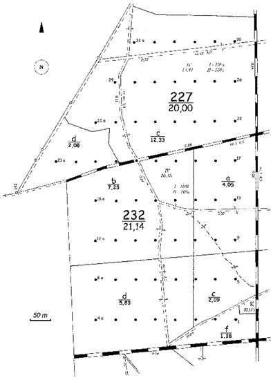 Permanent circular plots (63) of 0.05 ha each (r = 12.62 m) were schematically laid out in the nodes of a 100 m × 50 m rectangular net (Figure 1). All of them were established 25 years ago. The total size of the forest sampled was 41.14 ha.