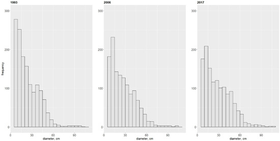 Diameter structure for all living trees present in the multispecies, uneven-aged forest in 1993, 2006 and 2017.