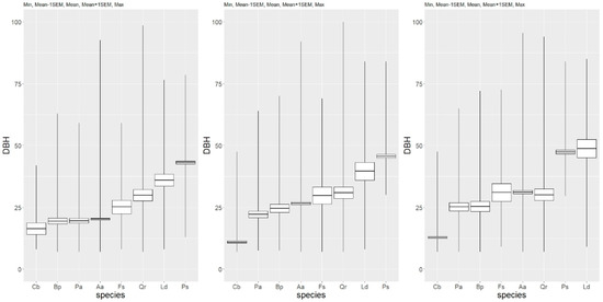 Boxplots for the diameter of tree species present in the multispecies, uneven-aged forest in 1993, 2006, and 2017 (from left to right) (ascending order).