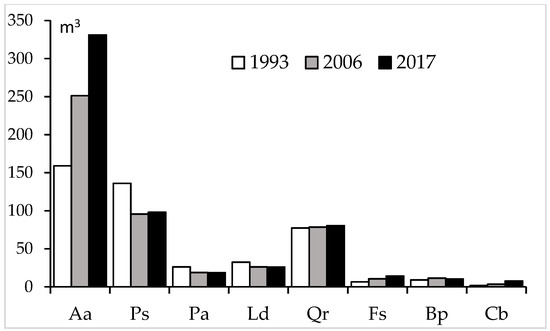In the analyzed period, timber volume increased for the fir and all broadleaved tree species (the oak, beech, birch, and hornbeam), but decreased for other conifers (Table 3, Figure 4).
