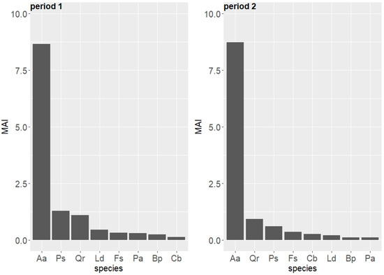 Species-specific mean annual volume increment (MAI, m3 ha−1 y−1) in two periods (period 1: 1996–2006 and period 2: 2007–2017) in the uneven-aged forest located in the Unieszów Forestry Range.
